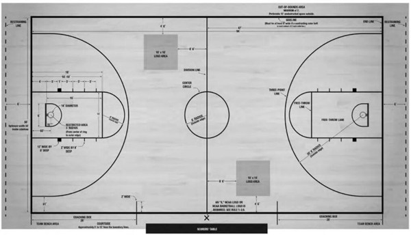 比赛场地应为矩形表面,没有障碍物,边线长94英尺,线长50英尺,从图中所示的内边缘量起。场地应在法院图上标明边界线(边线和端线)和其他线条和标记。所有的行必须清晰可辨。